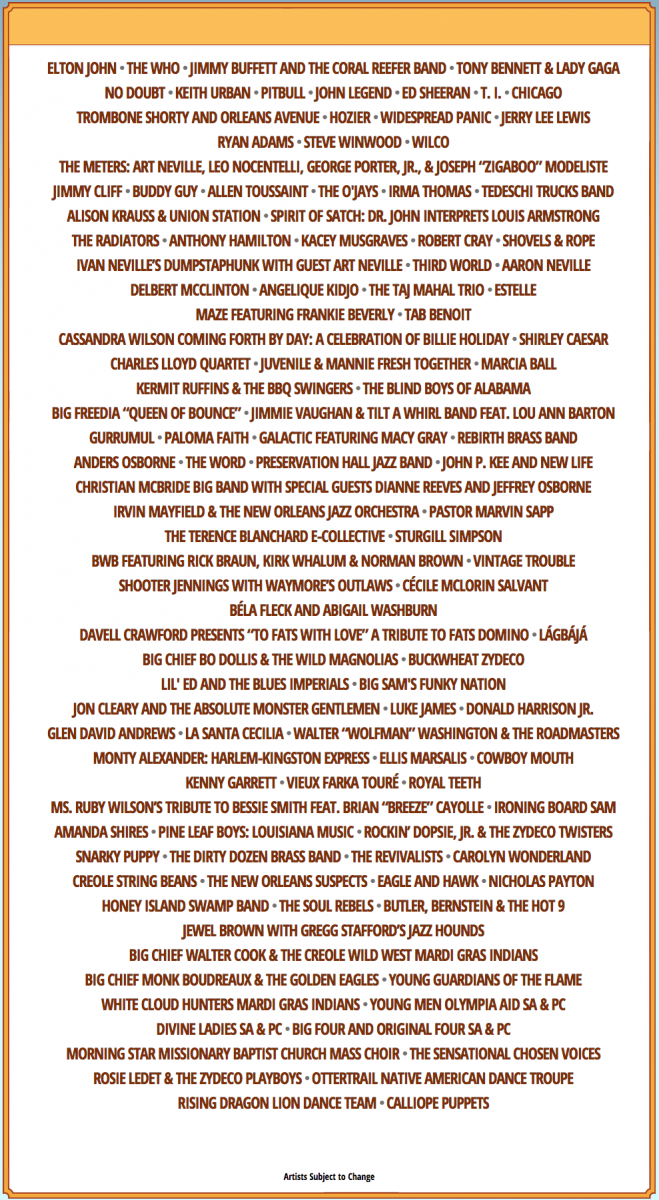 And that’s just to name a few. A lot of local artists will also be performing, like Aaron Neville, Kermit Ruffins, Dukes of Dixieland, Shotgun Jazz Band, Allen Toussaint and more.